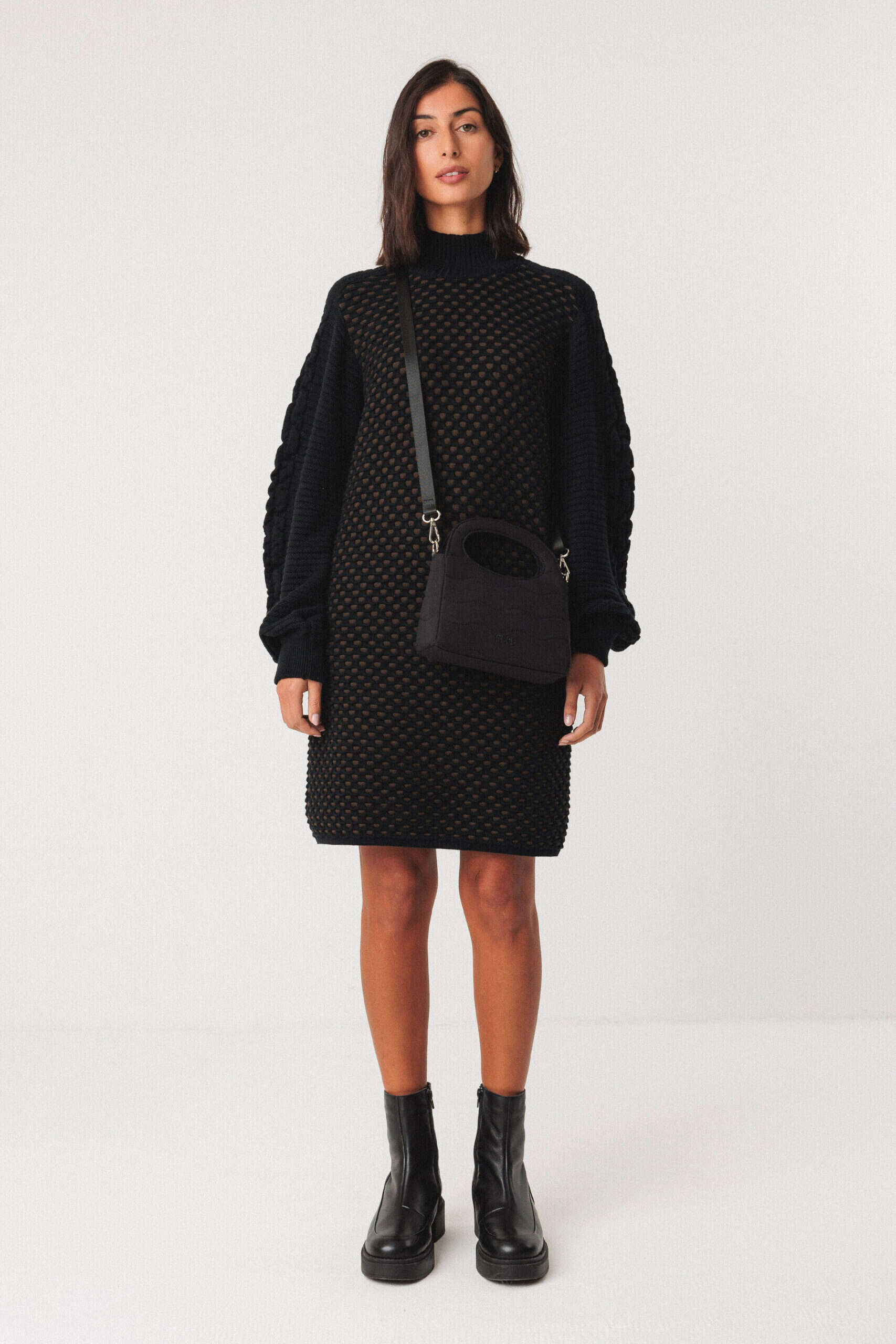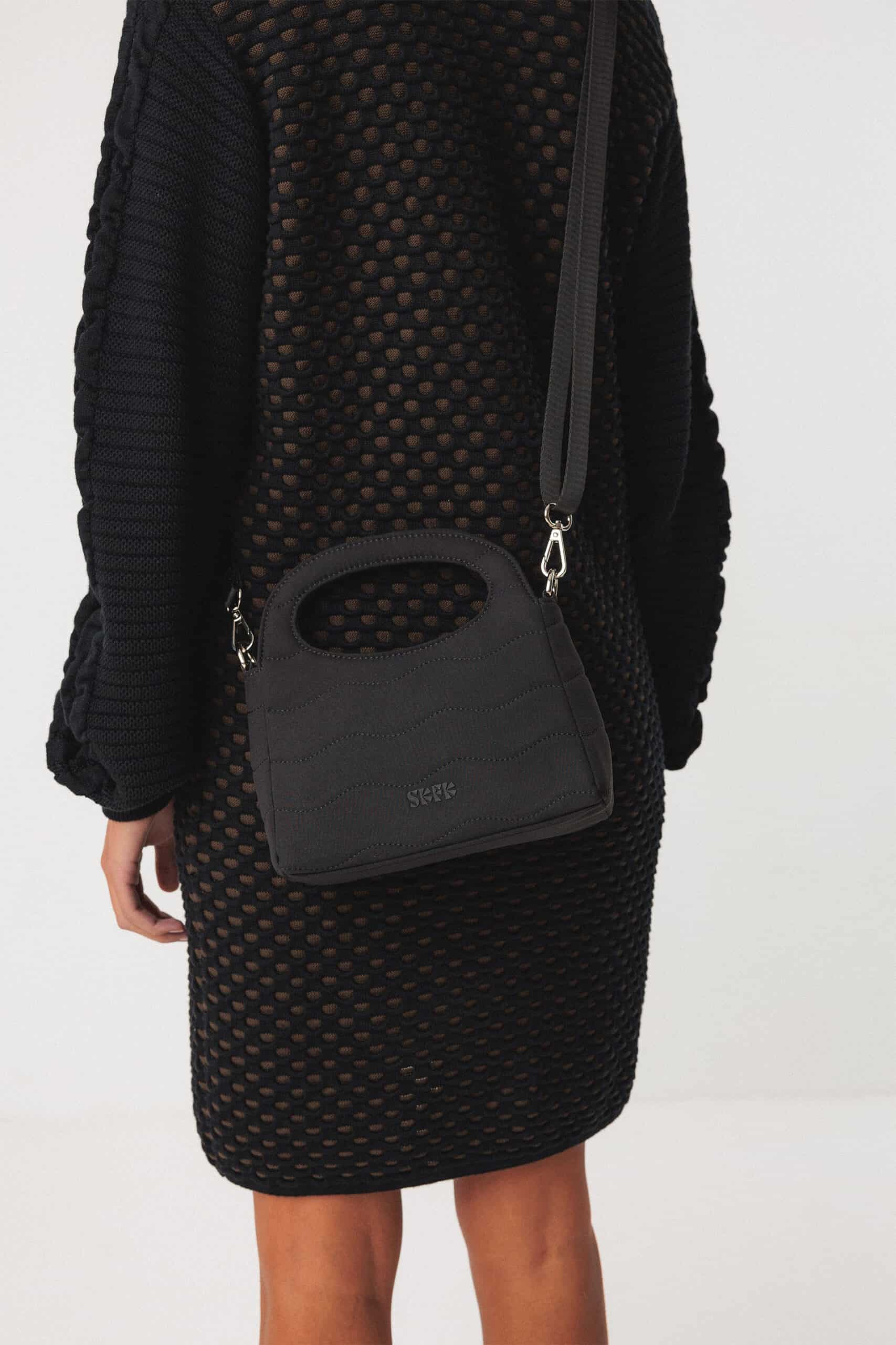 Bolso cuadrado pequeño que se puede llevar en bandolera o del asa. Cierre magnético y bolsillo interior. Color negro.