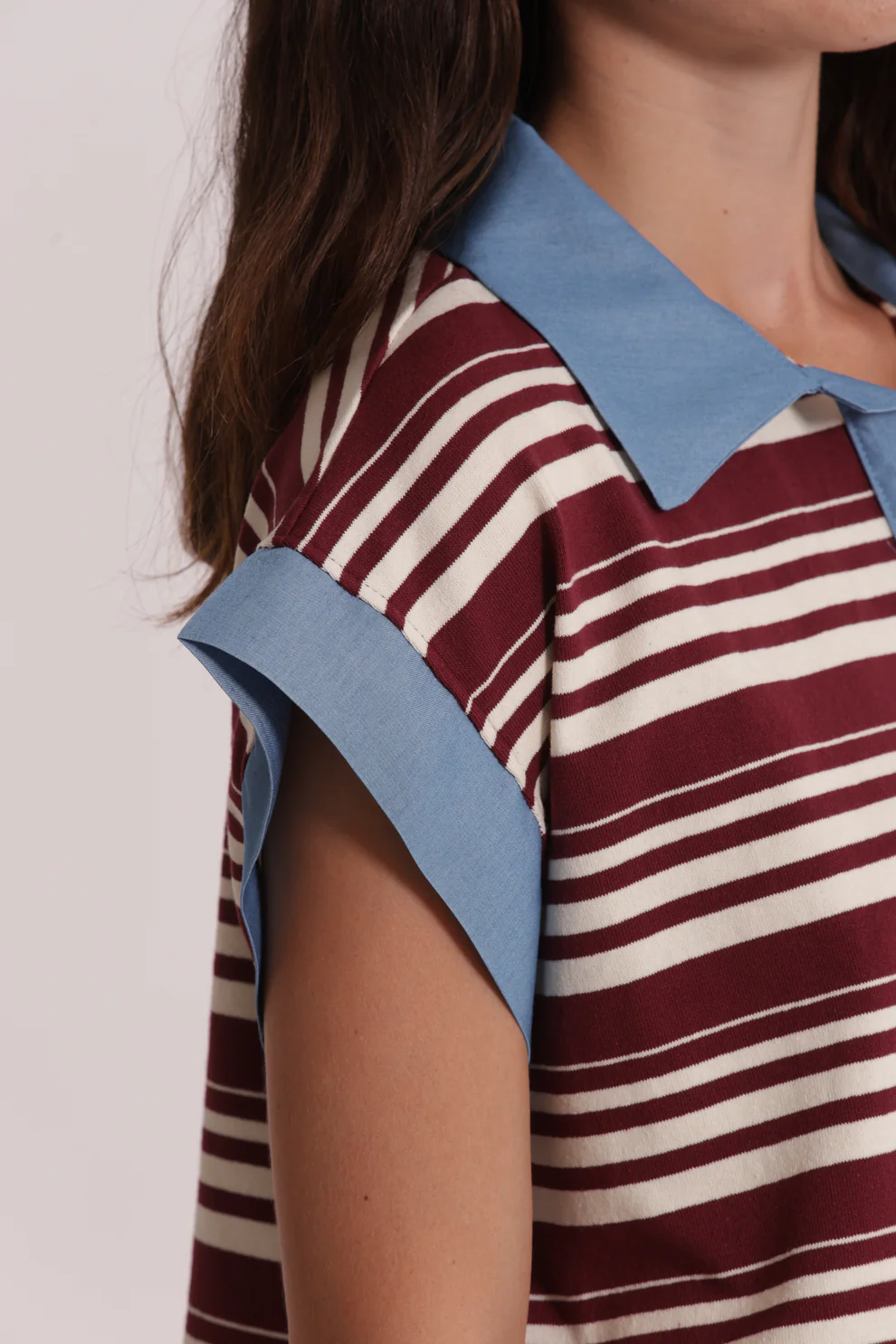 Camiseta con cuello rayada e inserciones de denim