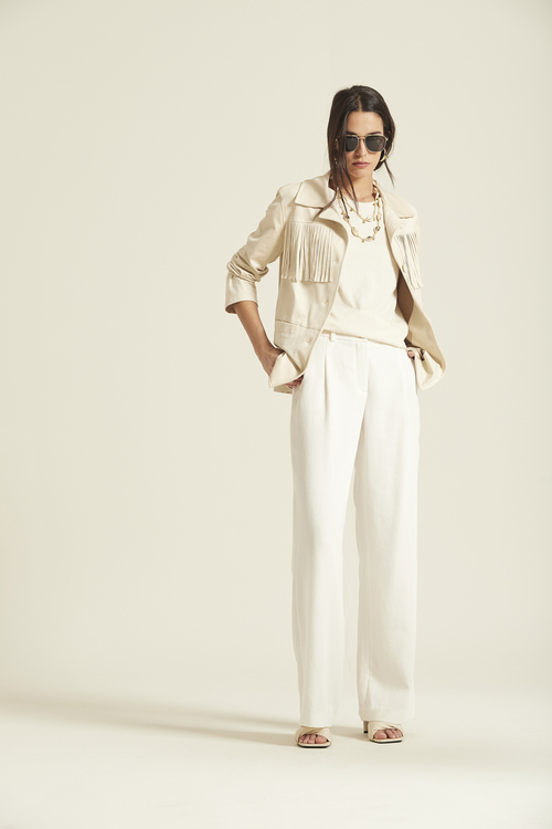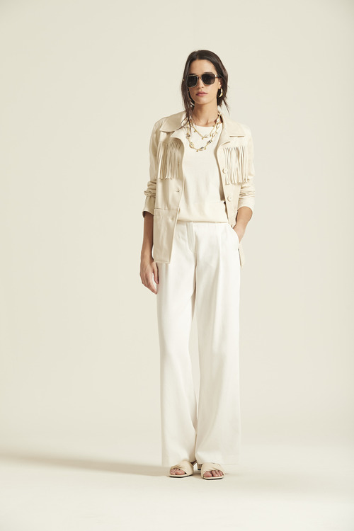 Destaca por su detalle de flecos en el canesú frontal, cuello camisero, cierre de botones y bolsillos de plastrón que le confieren un aire retro y sofisticado