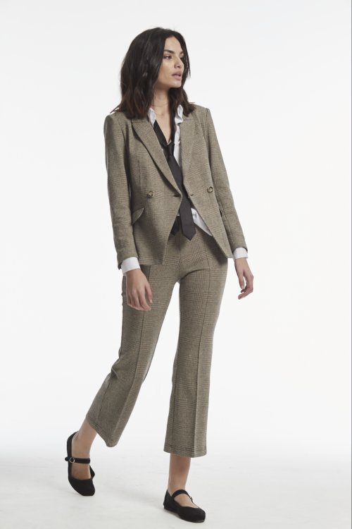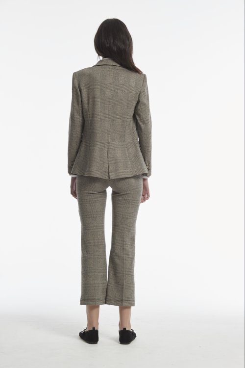 - Tejido jacquard de cuadros: El patrón de cuadros en tejido jacquard aporta textura y profundidad visual, dándole un estilo distintivo y refinado.