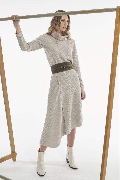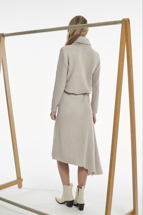 La falda Clavo combina el estilo contemporáneo con la comodidad del punto efecto pana. Su diseño asimétrico, con cortes estratégicos, crea un look dinámico y moderno, mientras que la cintura elástica garantiza un ajuste cómodo y favorecedor. Los pespuntes a contraste añaden un toque único y llamativo, destacando los detalles artesanales de la prenda.