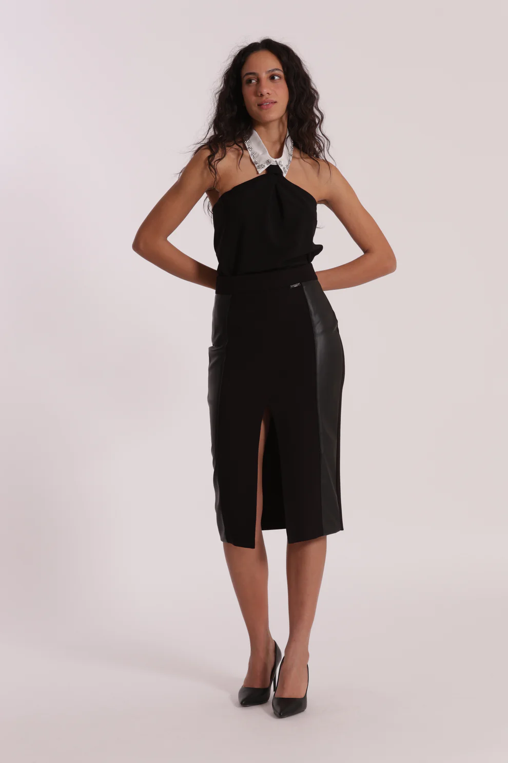MiaModa » COLECCIÓN » FALDA LÁPIZ CON DETALLES DE CUERO SINTÉTICO