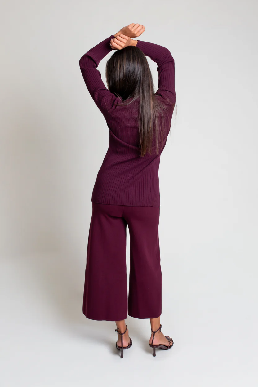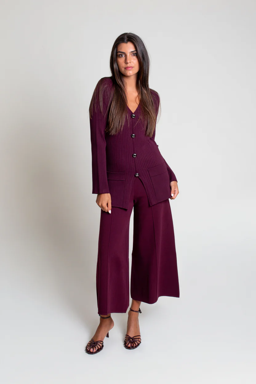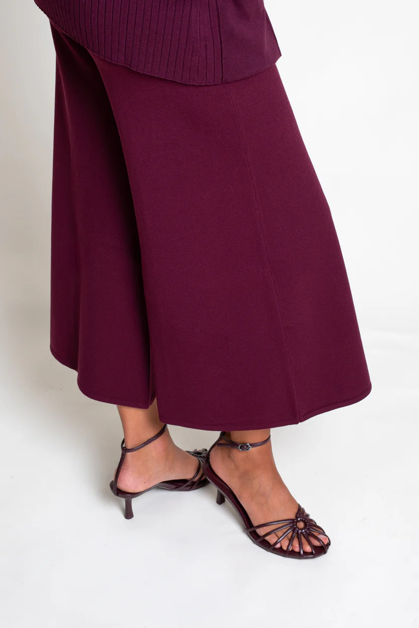 Pantalón en punto tricot tipo culotte con pernera ancha. Nervio marcado en delantero. Cintura con goma. Color Granate