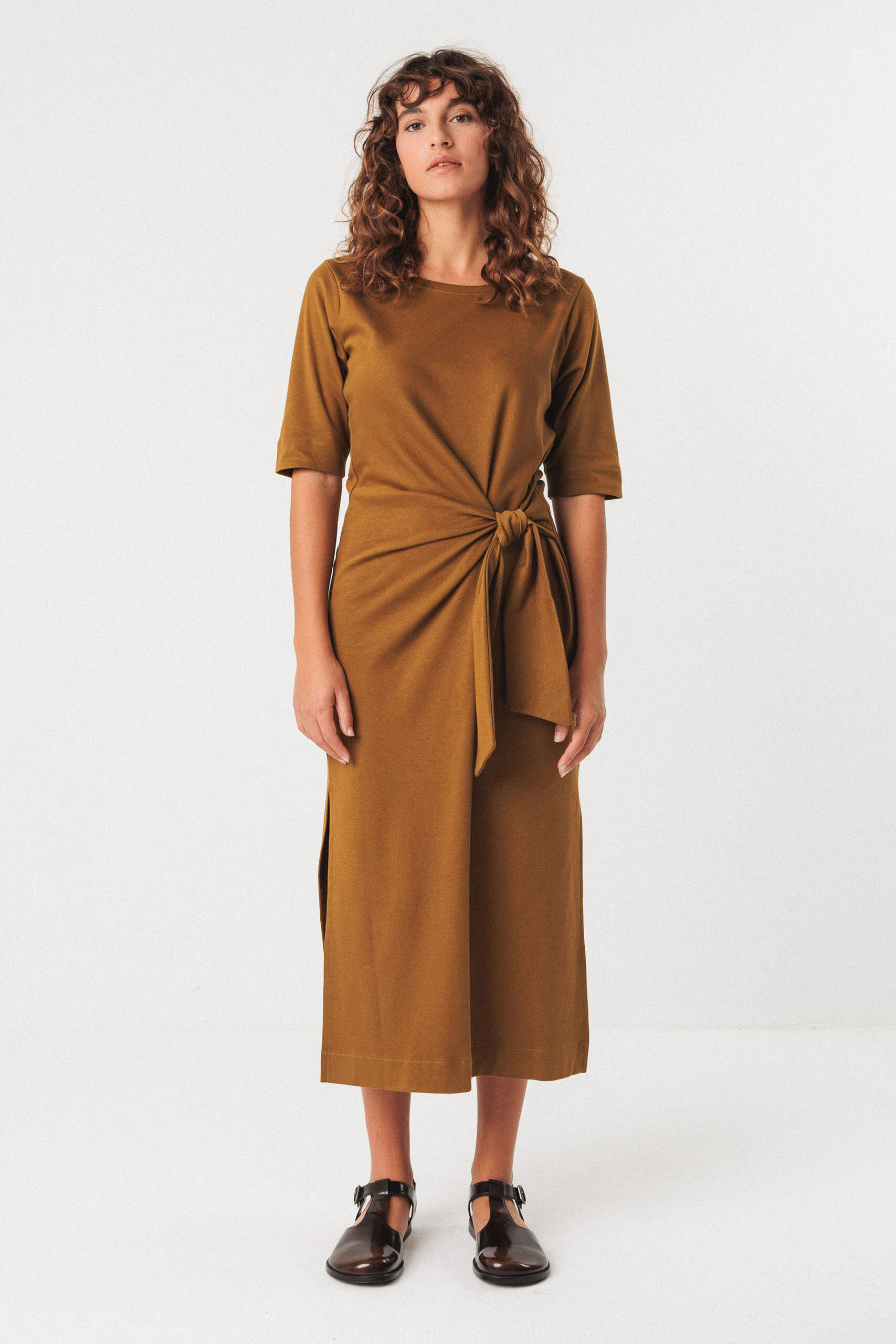 Vestido midi ceñido con cuello barco, de manga corta y con un detalle anudado en la parte delantera. Se pone fácilmente y tiene unas aperturas en la parte baja de los laterales para mayor comodidad.