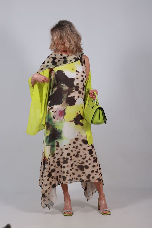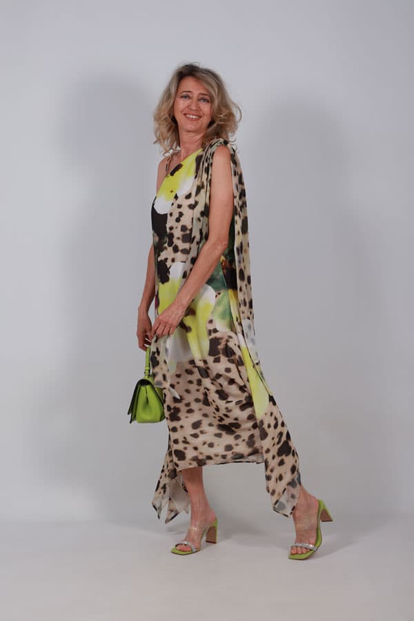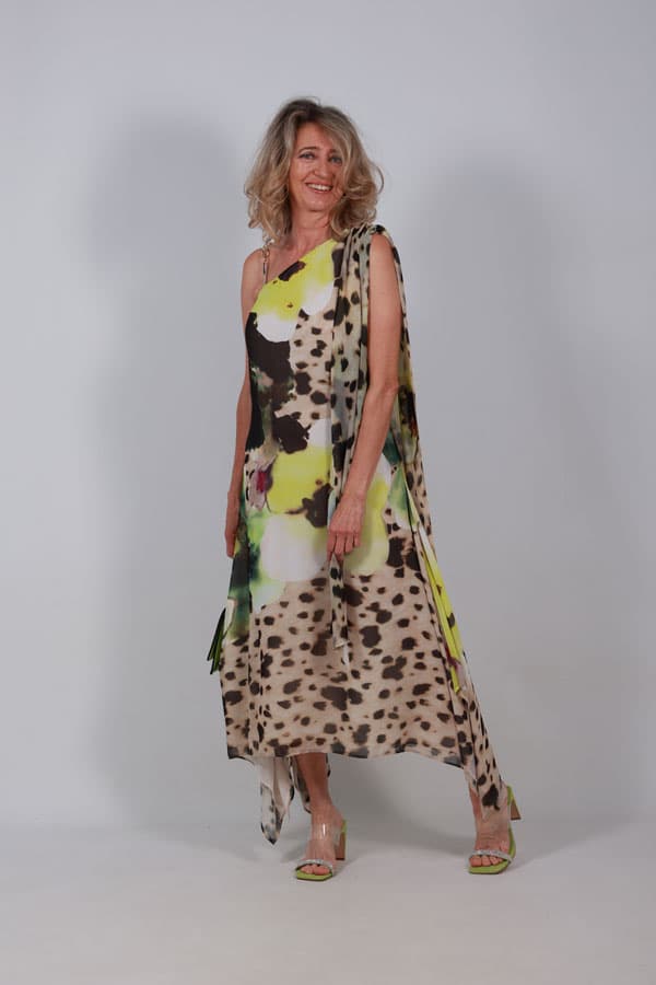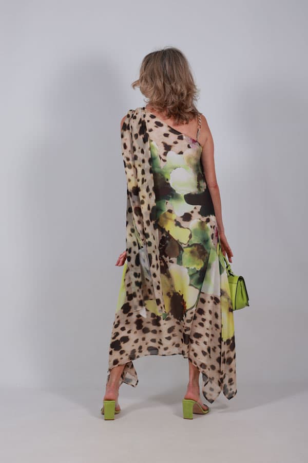 Vestido animal print midi fluido con escote asimétrico. Color Estampado