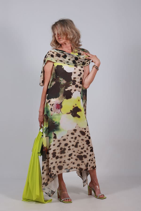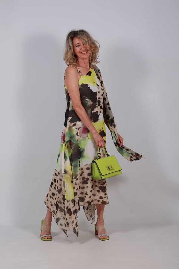 Vestido animal print con largo midi. Su tejido es fluido, ligero y vaporoso. Estampado animal print con alguna flor grande. Su largo midi termina con unas irregularidades laterales. Escote asimétrico. Un tirante de cadena dorada desmontable convirtiéndose en un vestido de un solo tirante del tejido del vestido. El tirante de tejido lleva cosido un mini fular cayendo por ambos lados.Diseño entallado hasta cadera continuando con una línea evasé que le aporta movimiento al andar. Cierre de cremallera en el lateral. Prenda forrada. Este Vestido animal print es ideal tanto para un evento como para una cena veraniega, es perfecto. El vestido talla pequeño, la modelo es una talla 38 y lleva una talla 42