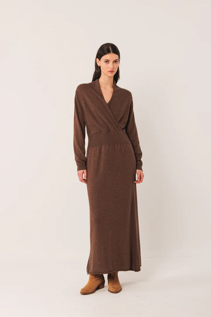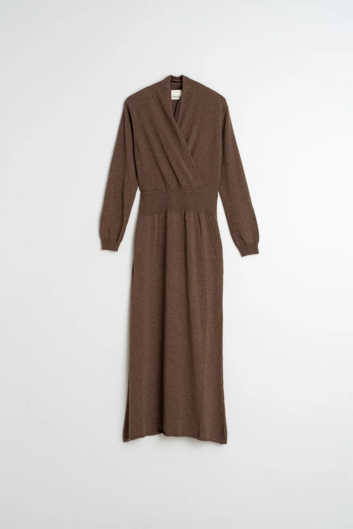 Nuestro vestido de punto con lana y cashmere tiene cuello kimono y escote cruzado. Se ajusta con canalé en la parte de la cintura, logrando una silueta femenina y sofisticada. Color Topo