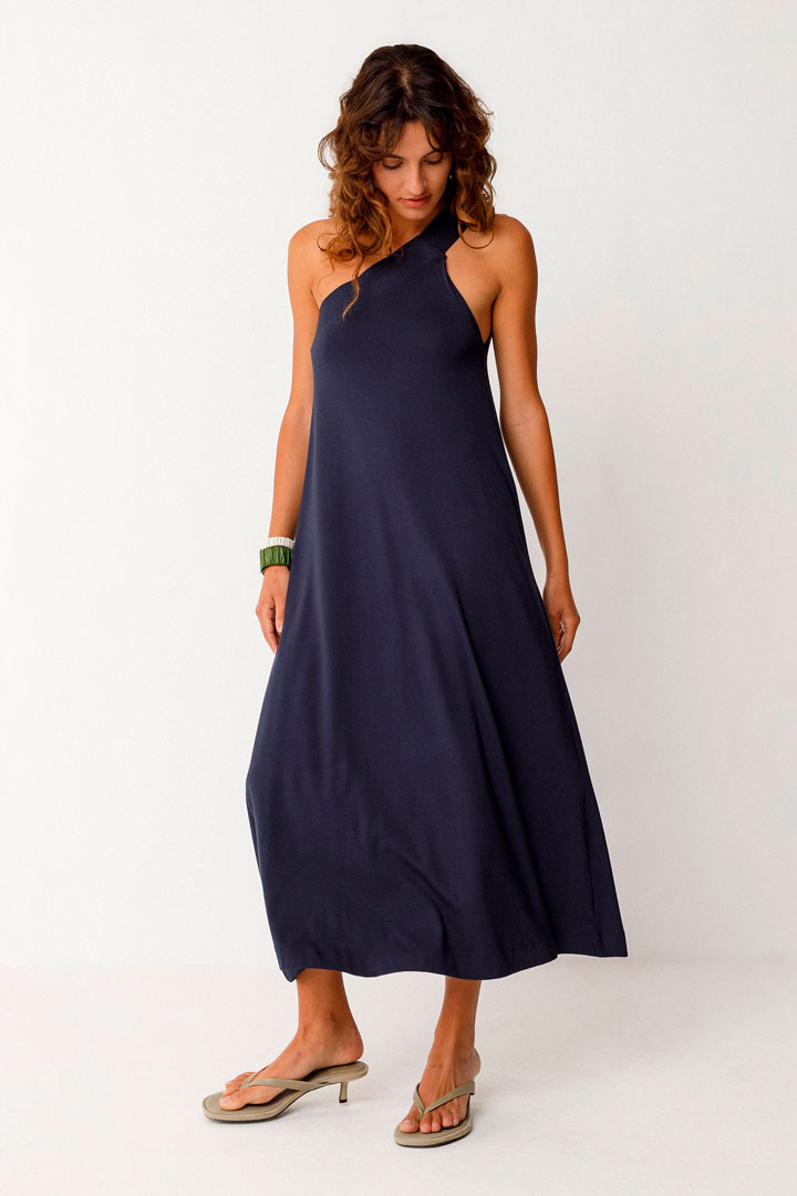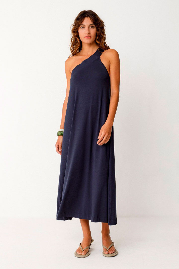 Vestido Naiade midi de corte trapecio con tirante asimétrico.
