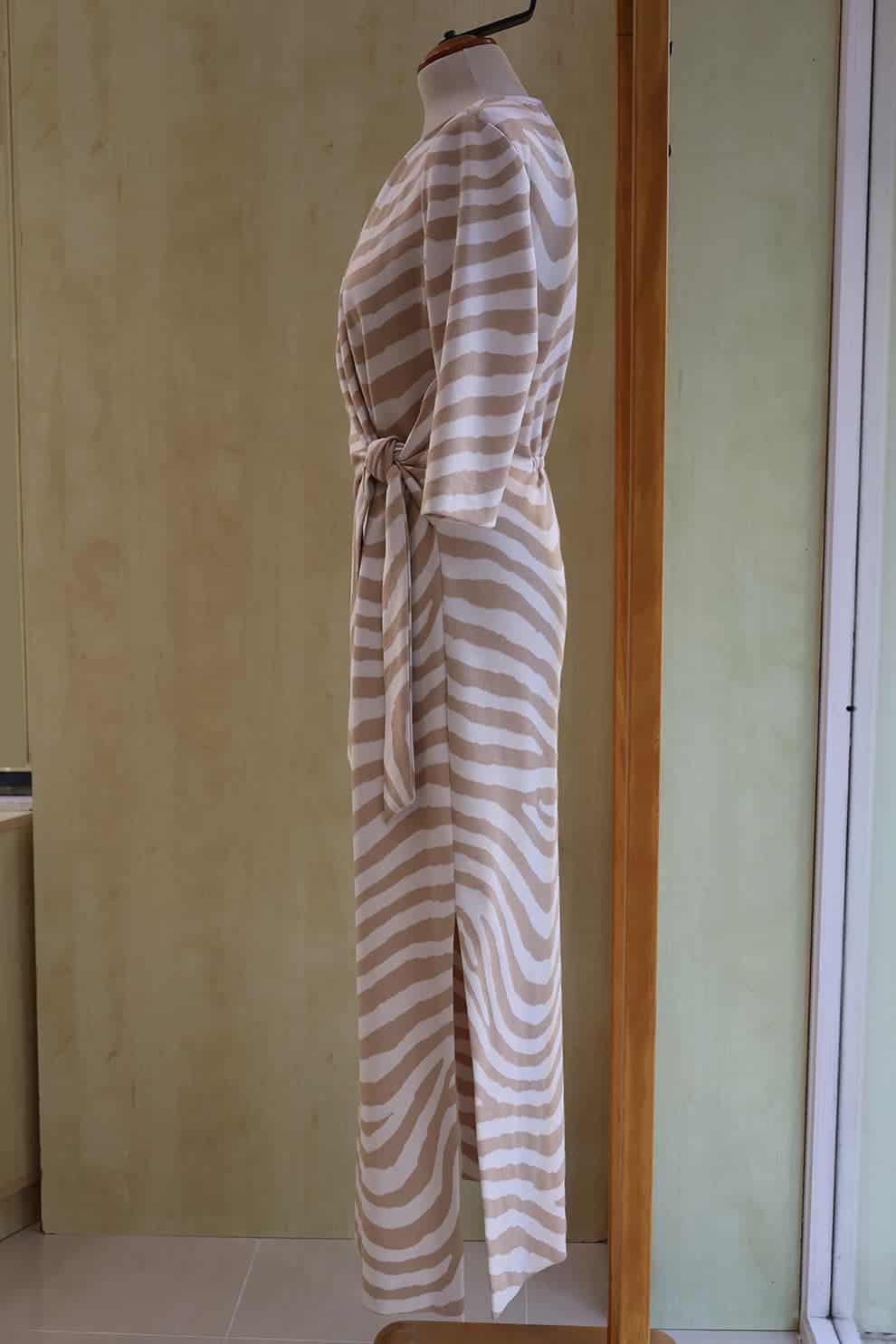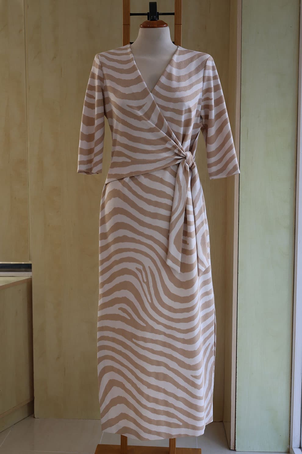 Vestido midi estampado de punto con diseño cruzado, nudo lateral y abertura discreta. Elegante y cómodo, ideal para oficina, eventos o uso diario. Modelo SINAL4. Color Beige. Composición 50% poliester, 49%Viscosa y 1% Elastano. Disponible Talla 42.